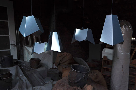 are both suspension lamps that feature a angular folded shade that is made from a single piece of aluminum